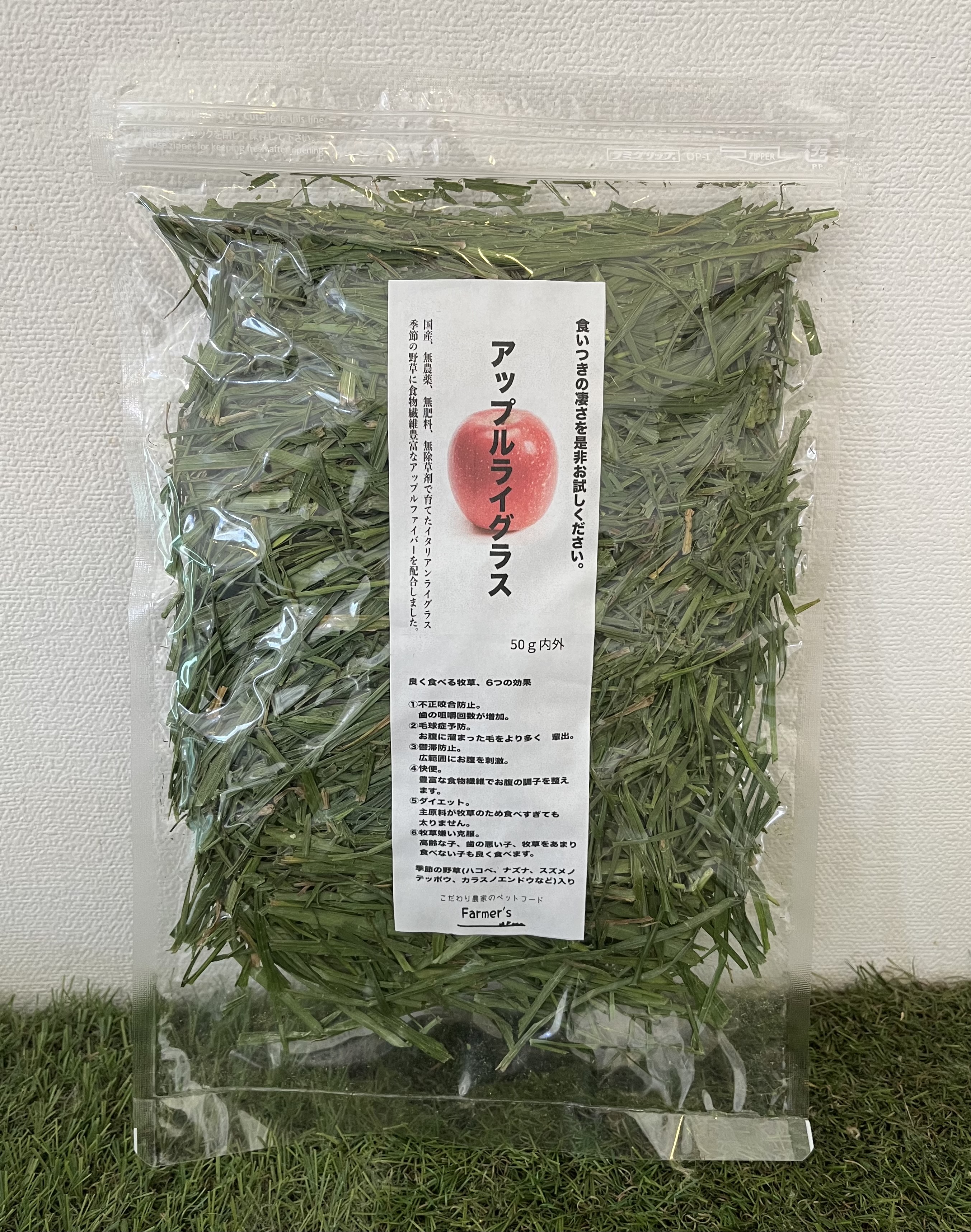 国産、無農薬、無肥料、無除草剤で育てたイタリアンライグラス・季節の野草に食物繊維が豊富なアップルファイバーを配合した商品です。