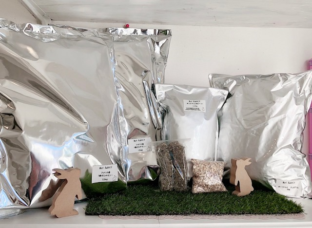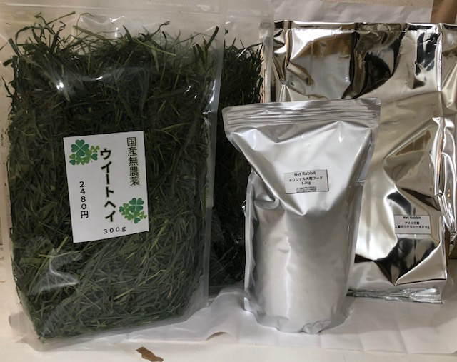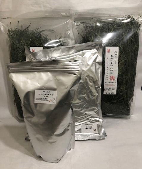 【代用セット】 ・一番刈りチモシー1.5kg×2点 ・大粒フード1.2kg ・オーツヘイ1kg ・麦130g ・アルファルファキューブ200g 4400円税込 【通常セット】欠品中 ・イタリアンライグラス300g×2 ・大粒フード1.2s ・一番刈りチモシー600g 4800円税込 わかり辛い場合、以下のメールアドレスもしくはお電話番号のほうに直接ご連絡ください。 メールnetrabbit8@gmail.com お電話・FAX042-398-4568 |