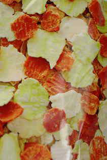キャベツの芯を乾燥させたものにえんどう豆とにんじんを乾燥させローラーでつぶしたものを配合。ぱりぱりと歯ごたえのよい野菜チップスです。