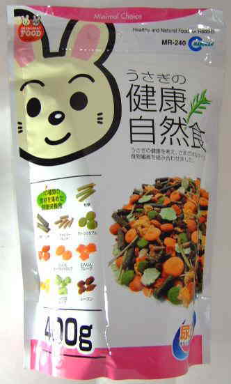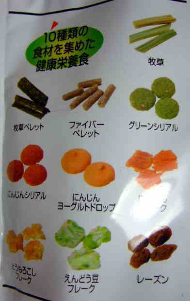 本品には牧草、ペレット、ファイバーペレット、グリーンシリアル、にんじんシリアル、にんじんフレーク、とうもろこしフレーク、えんどう豆フレーク、レーズンがブレンドされており牧草、牧草ペレット、アルファルファを使用しました。チャック付きアルミ包装。